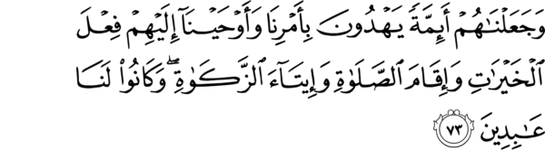 “We made them leaders (imam), guiding by Our command, and inspired them to do good deeds, establish prayer, and pay alms-tax. And they were devoted to Our worship” Quran 21:73